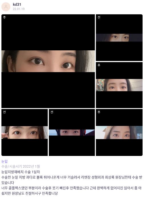 Лиенжан гоо сайхны мэс заслын эмнэлэг ★★★★★ 5.0 [바비톡] 눈밑지방재배치 / 1개월차 / 닉네임 : kd31 | 2022.03.17 | 16 Сэтгэгдэл жагсаалт руу