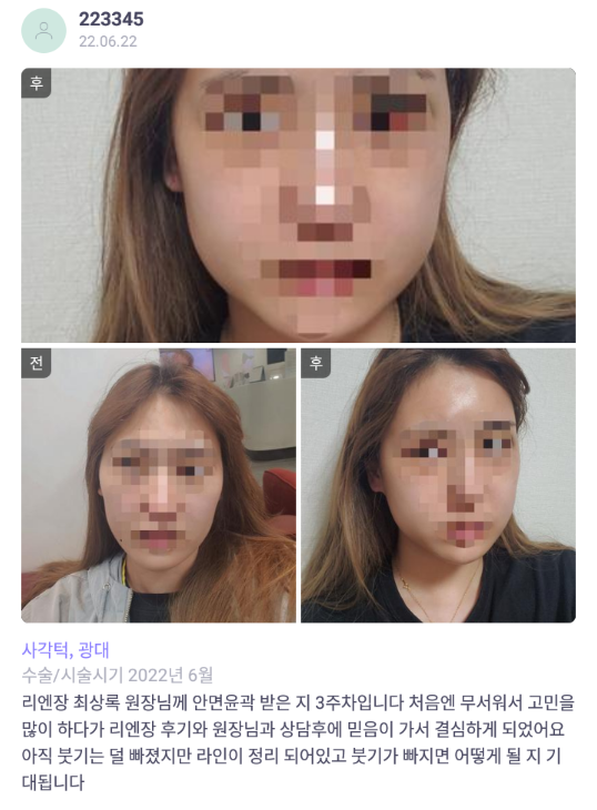 Лиенжан гоо сайхны мэс заслын эмнэлэг ★★★★★ 5.0 [바비톡] 광대, 사각턱 / 3주차 / 닉네임:223345 | 2022.07.08 | 17 Сэтгэгдэл жагсаалт руу