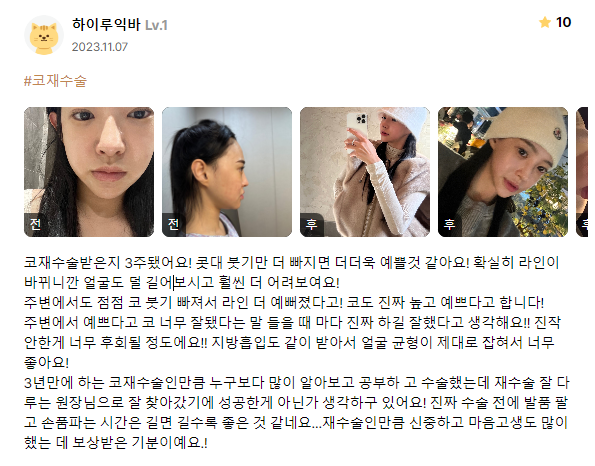 Лиенжан гоо сайхны мэс заслын эмнэлэг ★★★★★ 5.0 [강남언니 후기] 코재수술 / 3주차 / 닉네임:하이루익바 | 2024.03.07 | 17 Сэтгэгдэл жагсаалт руу