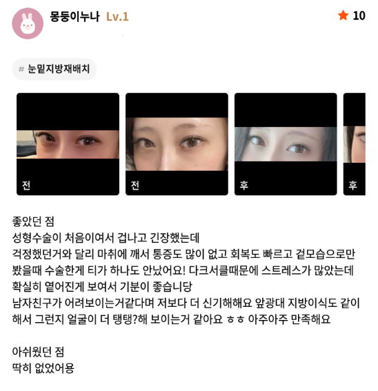 Лиенжан гоо сайхны мэс заслын эмнэлэг ★★★★★ 5.0 [강남언니] 눈밑지방재배치 / 1개월차 / 닉네임 : 몽둥이누나 | 2024.07.17 | 13 Сэтгэгдэл жагсаалт руу